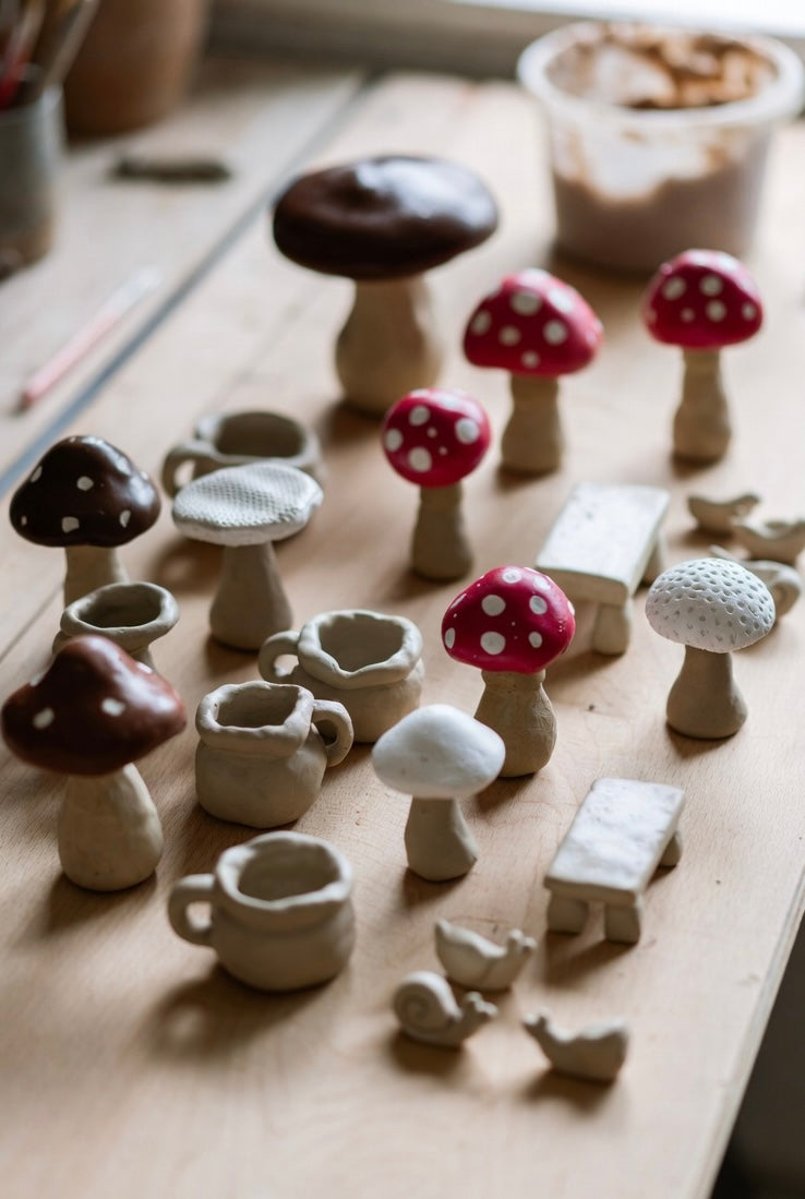 A magical clay session where kids create their own fairy-garden accessories — tiny mushrooms, rabbits, stools, and other whimsical treasures to decorate their rooms or outdoor fairy spaces.